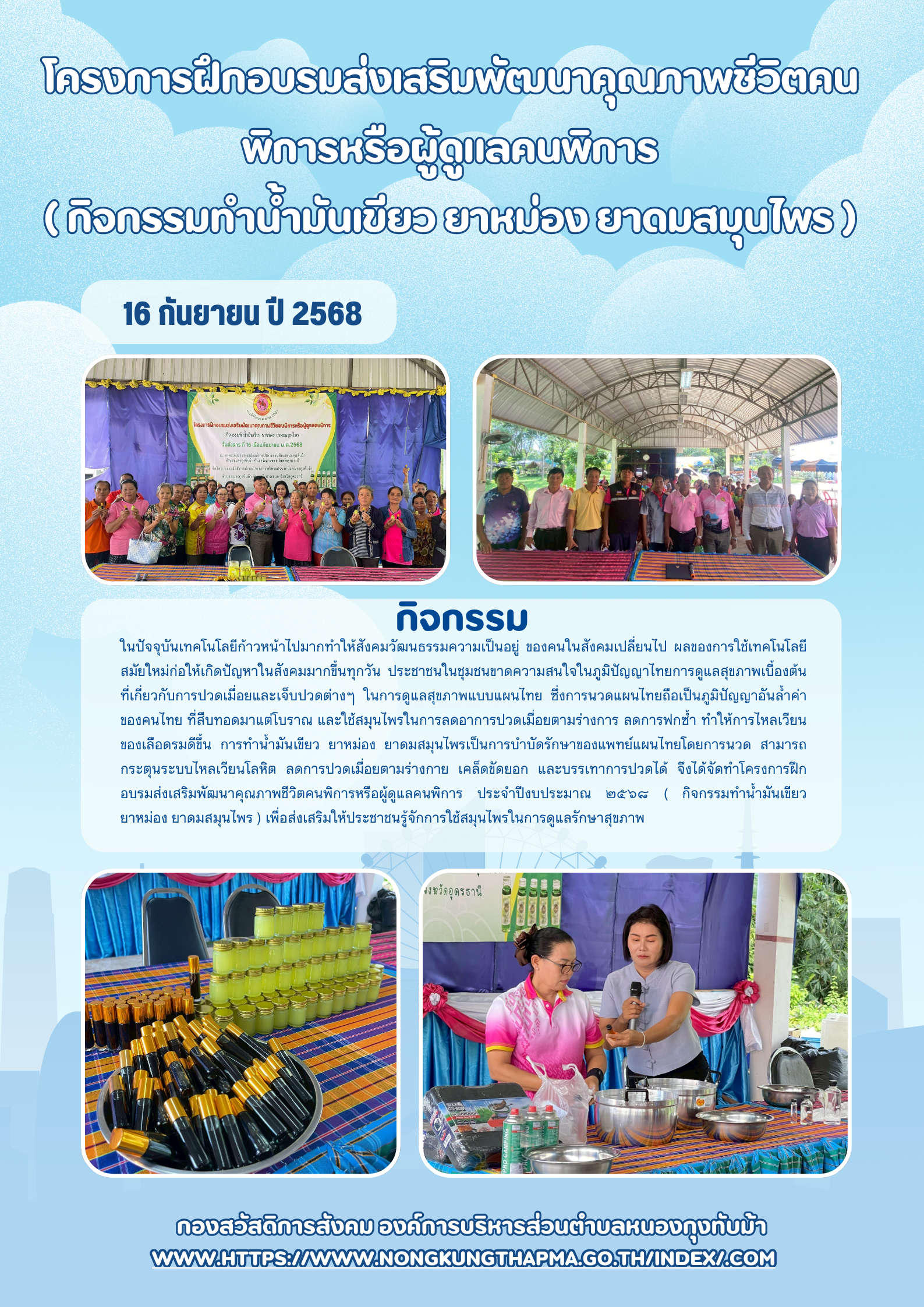 โครงการฝึกอบรมส่งเสริมพัฒนาคุณภาพชีวิตคนพิการหรือผู้ดูแลคนพิการ ( กิจกรรมทำน้ำมันเขียว ยาหม่อง ยาดมสมุนไพร )