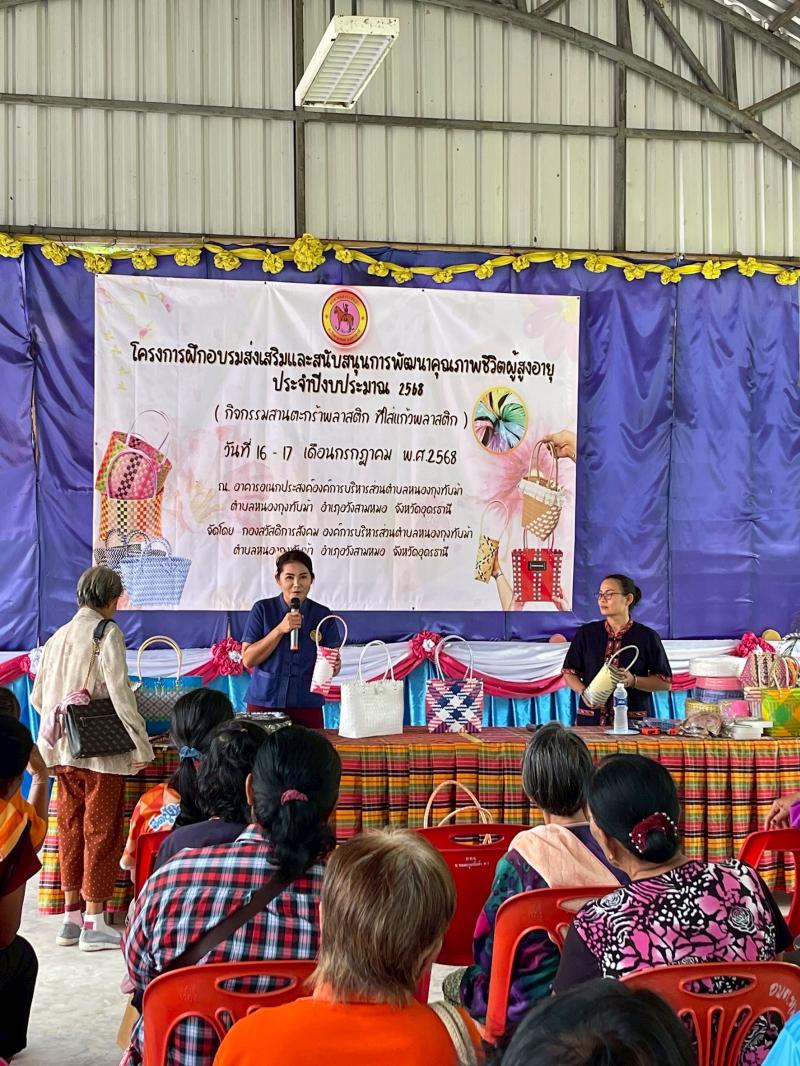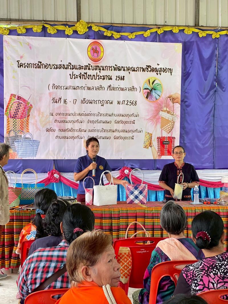 รายละเอียด : องค์การบริหารส่วนตำบลหนองกุงทับม้า กองสวัสดิการสังคม จัดโครงการฝึกอบรมส่งเสริมและสนับสนุนการพัฒนาคุณชีวิตผู้สูงอายุ ประจำปีงบประมาณ 2568 ( กิจกรรมสานตะกร้าพลาสติก ที่ใส่แก้วพลาสติก ) จัดขึ้นในวันที่ 16-17 กรกฎาคม พ.ศ.2568 โดยมีคณะผู้บริหารนำโดย นายสุบัน พลรักษา รองนายกองค์การบริหารส่วนตำบลหนองกุงทับม้าเป็นประธานในพิธีเปิดงานในครั้งนี้ ในปัจจุบัน ได้เล็งเห็น ว่าถุงพลาสติกที่ใช้รับรองสินค้าและอาหารจะมีอายุการใช้งานที่สั้น ส่วนใหญ่เป็นการใช้งานเพียงครั้งเดียว เมื่อใช้งานเสร็จแล้วจะถูกนำไปทิ้งกลายเป็นขยะ ที่ยากต่อการย่อยสลายอย่างมาก กองสวัสดิการสังคม จึงเห็นปัญหาที่กล่าวมาข้างต้นจึงได้จัดทำโครงการฝึกอบรมส่งเสริมและสนับสนุนการพัฒนาคุณชีวิตผู้สูงอายุ ( กิจกรรมสานตะกร้าพลาสติก ที่ใส่แก้วพลาสติก ) ส่งเสริมให้ผู้เข้าร่วมโครงการใช้เวลาว่างให้เกิดประโยชน์อีกทั้งยังช่วยฝึกสมาธิอีกด้วย สามารถนำความรู้ที่ได้ไปประยุกต์ใช้ในชีวิตจริง และสามารถนำไปต่อยอดเป็นอาชีพเสริมได้ต่อไปส่งเสริมให้ประชาชนมีรายได้ ลดรายจ่ายในครัวเรือน