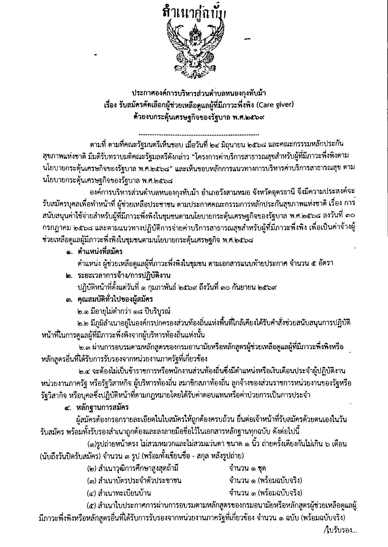 รับสมัครคัดเลือกผู้ช่วยเหลือดูแลผู้ที่มีภาวะพึ่งพึ่งพิง (Care giver) ด้วยงบกระตุ้นเศรษฐกิจของรัฐบาล พ.ศ.๒๕๖๙