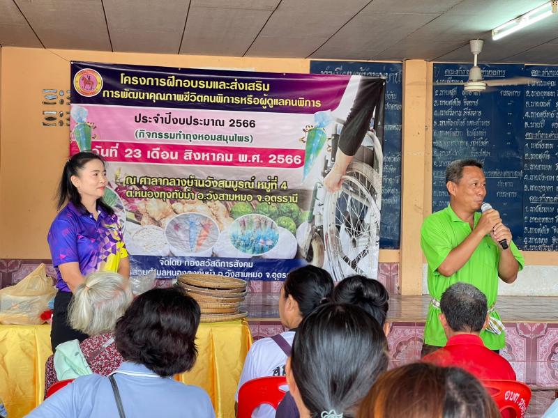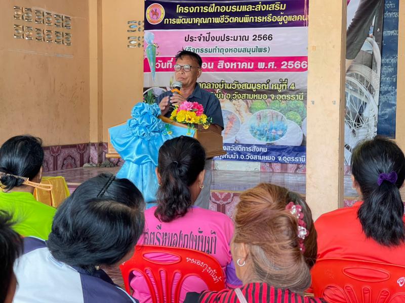 รายละเอียด : กองสวัสดิการสังคม ดำเนินโครงการฝึกอบรมและส่งเสริมการพัฒนาคุณภาพชีวิตคนพิการหรือผู้ดูแลคนพิการ ประจำปีงบประมาณ ๒๕๖๖ (กิจกรรมทำถุงหอมสมุนไพร) วันที่ ๒๓ สิงหาคม ๒๕๖๖ ณ. ศาลากลางบ้าน วังสมบูรณ์ หมู่ที่ ๔ โดยมีวัตถุประสงค์ ➀.เพื่อบริการประชาชนและเสริมสร้างความรู้และทักษะพร้อมทั้งเพิ่มขีดความสามารถของคนพิการหรือผู้ดูแลคนพิการ ➁.เพื่อเสริมสร้างศักยภาพการพัฒนาตนเองของประชาชนและคนพิการหรือผู้ดูแลคนพิการ ให้เป็นที่ยอมรับ ➂.เพื่อให้คนพิการหรือผู้ดูแลคนพิการได้ใช้ประสบการณ์และภูมิปัญญาเพื่อสร้างประโยชน์แก่ครัวเรือนและชุมชน เป้าหมายที่เข้าร่วมโครงการ คือ คนพิการหรือผู้ดูแลคนพิการ ประชาชนที่สนใจเข้าร่วมรับฟังและเข้าร่วมอบรมทำกิจกรรมถุงหอมสมุนไพร ประจำปีงบประมาณ ๒๕๖๖