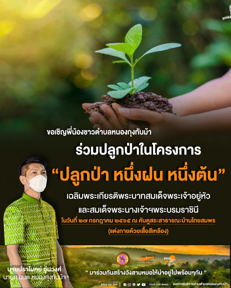รายละเอียด : วันที่ ๒๗ กรกฎาคม ๒๕๖๕ เวลา ๐๙.๐๐ น. เป็นต้นไป ปราโมทย์ อุ่นวงศ์ - Pramot Oonwong นายกองค์การบริหารส่วนตำบลหนองกุงทับม้าเป็นประธานเปิดโครงการ “ปลูกป่า หนึ่งฝน หนึ่งต้น” เพื่อเฉลิมพระเกียรติพระบาทสมเด็จพระเจ้าอยู่หัวและสมเด็จพระนางเจ้าฯพระบรมราชินี วันที่ ๒๗ กรกฎาคม ๒๕๖๕ ณ คันคูสระสาธารณะบ้านไทยสมพร ประจำปีงบประมาณ ๒๕๖๕