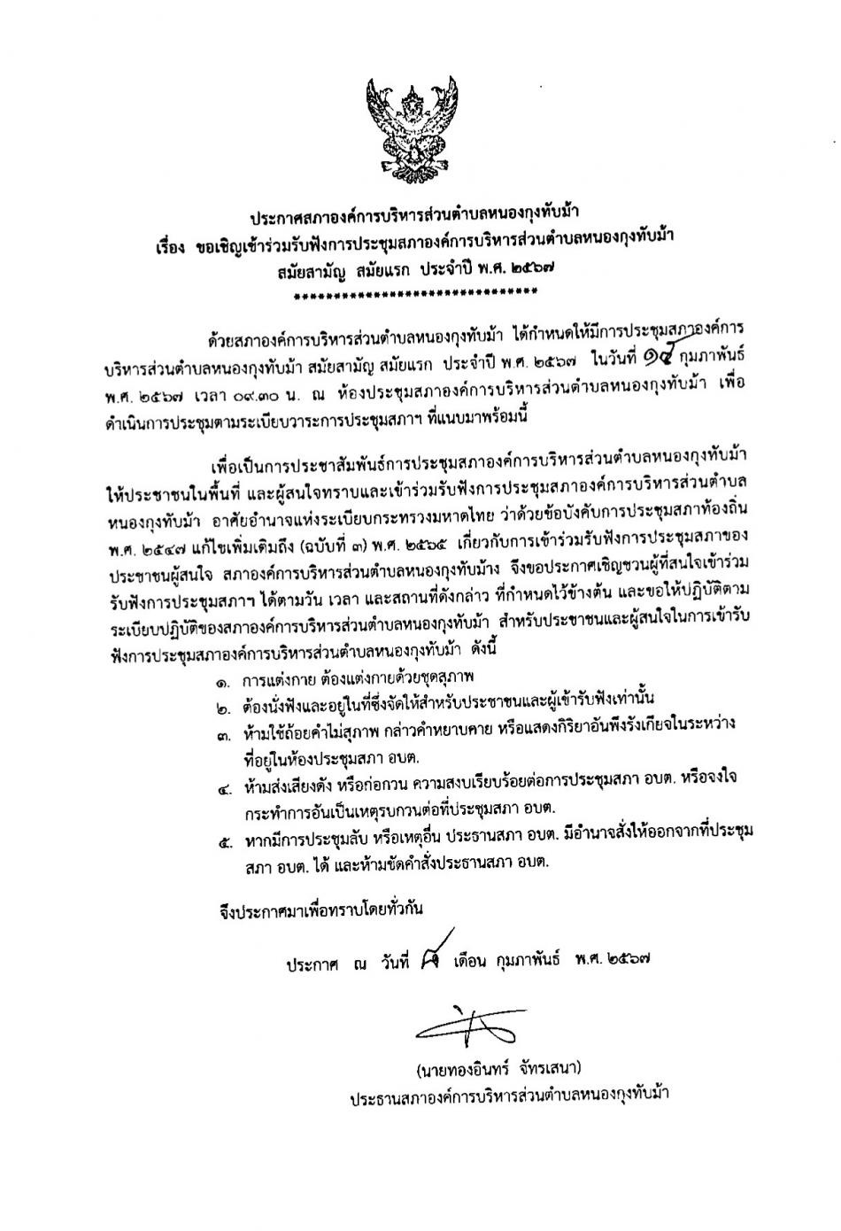 ขอเชิญเข้าร่วมรับฟังการประชุมสภาองค์การบริหารส่วนตำบลหนองกุงทับม้า สมัยสามัญ สมัยแรก ประจำปี พ.ศ. 2567 [12 กุมภาพันธ์ 2567]